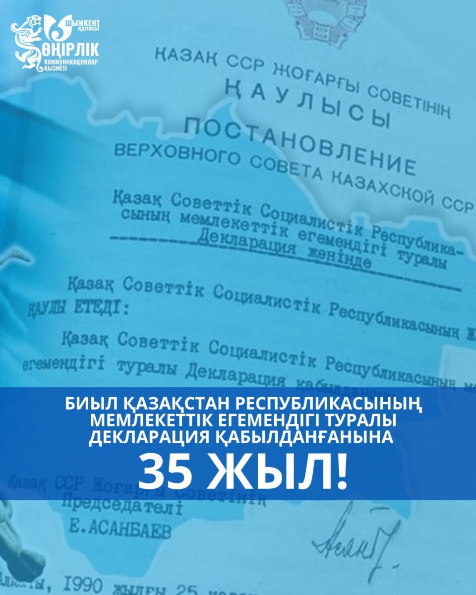 Биыл Қазақстан Республикасының мемлекеттік егемендігі туралы Декларация қабылданғанына 35 жыл толып отыр. 1990 жылғы 25 қазанда Қазақ Кеңестік Социалистік Республикасының Жоғарғы Кеңесі тарихи маңызы зор құжат «Қазақ КСР-інің мемлекеттік егемендігі туралы Декларацияны» қабылдады. Бұл еліміздің тәуелсіздікке бастар алғашқы әрі шешуші қадамы болды.
