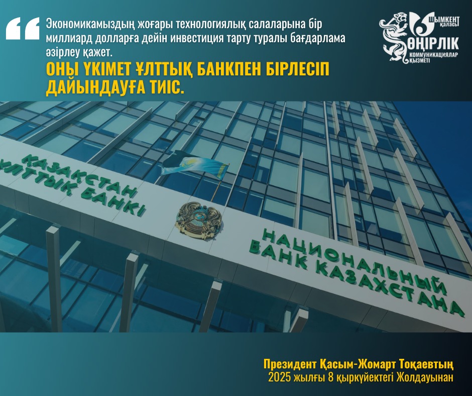 Бұл маңызды тапсырманы Үкімет пен Ұлттық банк бірлесіп жүзеге асыруы тиіс. Бағдарламаның негізгі мақсаты – елдің өндірістік және ғылыми-техникалық әлеуетін күшейтіп, жаңа жұмыс орындарын ашу, экспорттық мүмкіндіктерді кеңейту және экономиканы сапалы өсім траекториясына шығару.