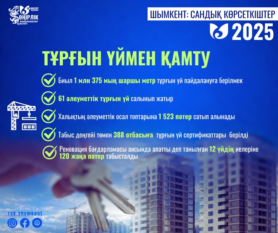 Шымкент қаласында тұрғын үймен қамтамасыз ету саласы әлеуметтік-экономикалық дамудың негізгі бағыттарының бірі болып саналады. Қала халқының өсімі мен тұрғындардың баспанаға деген сұранысын ескере отырып, жаңа тұрғын үйлердің құрылысы, инженерлік және әлеуметтік инфрақұрылымды дамыту, сондай-ақ тұрғын үйге қолжетімділікті арттыру бағытында кешенді әрі жүйелі жұмыстар атқарылуда. Бұл шаралар қаладағы әлеуметтік тұрақтылықты нығайтып, тұрғындардың өмір сүру сапасын жақсартуға мүмкіндік беруде.