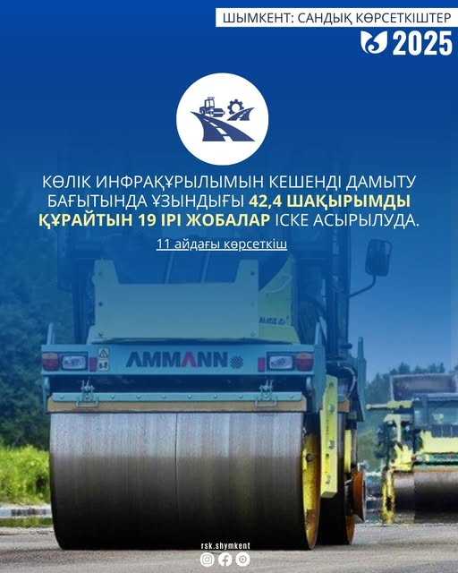 КӨЛІК ИНФРАҚҰРЫЛЫМЫ: ШЫМКЕНТТЕ 19 ІРІ ЖОБА ЖҮЗЕГЕ АСЫРЫЛУДА.Шымкент қаласында көлік инфрақұрылымын кешенді түрде дамыту бағытында ауқымды әрі жүйелі жұмыстар жүргізіліп жатыр. 2025 жылдың 11 айының қорытындысы бойынша қала аумағында жалпы ұзындығы 42,4 шақырымды құрайтын 19 ірі жол-көлік жобасы іске асырылуда. Бұл бастамалар шаһардың көлік жүйесін жаңғыртуға, жол сапасын арттыруға және тұрғындар үшін қолайлы әрі қауіпсіз орта қалыптастыруға бағытталған.