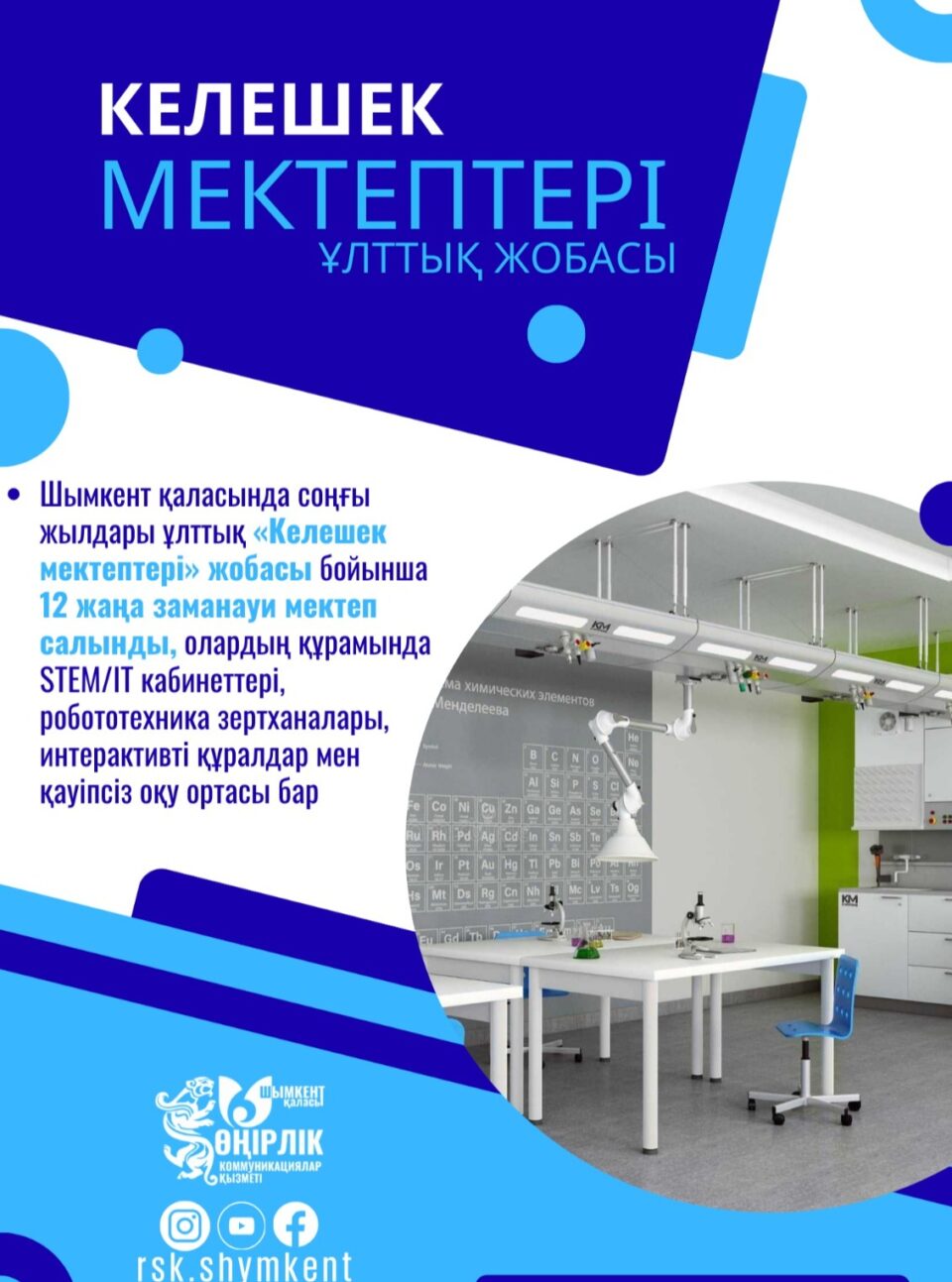 ШЫМКЕНТТЕ «КЕЛЕШЕК МЕКТЕПТЕРІ» ҰЛТТЫҚ ЖОБАСЫ АЯСЫНДА ЗАМАНАУИ БІЛІМ БЕРУ КЕҢІСТІГІ ҚАЛЫПТАСУДА.Мемлекет басшысының тапсырмасына сәйкес жүзеге асырылып жатқан «Келешек мектептері» ұлттық жобасы еліміздегі білім беру жүйесін түбегейлі жаңғыртуға бағытталған стратегиялық бастамалардың бірі болып табылады. Бұл жоба балаларға сапалы білім берумен қатар, қауіпсіз, қолайлы және заманауи оқу ортасын қалыптастыруды көздейді. Ұлттық жоба білім беру инфрақұрылымын жаңарту арқылы өскелең ұрпақтың зияткерлік әлеуетін арттыруға, олардың жан-жақты дамуына жағдай жасауға бағытталған.