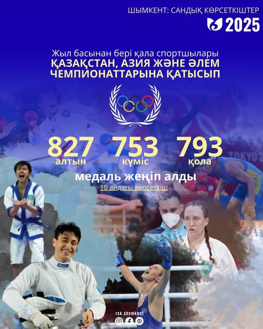 2025 жылдың алғашқы 11 айында шымкенттік спортшылар Қазақстан, Азия және әлем чемпионаттарына қатысып, барлығы 827 алтын, 753 күміс және 793 қола медаль жеңіп алды. Бұл көрсеткіштер 2024 жылдың сәйкес кезеңімен салыстырғанда (768 алтын, 642 күміс, 724 қола) едәуір өсім байқалғанын көрсетеді. Мұндай жетістіктер қаланың спорттық инфрақұрылымын жаңарту мен спортшыларды кәсіби дайындау бағытындағы жұмыстардың нәтижесі болып отыр.