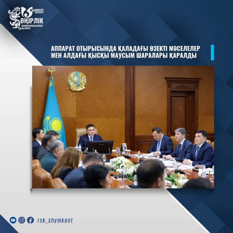Бүгін қала әкімі Ғабит Сыздықбековтің төрағалығымен аппарат отырысы өтті. Отырыс барысында жылыту маусымында қауіпсіздікті қамтамасыз ету, газбен улану және басқа да төтенше жағдайлардың алдын алу жөніндегі шаралар, сондай-ақ, жаппай сырғанауға арналған мұз алаңдарын, қысқы демалыс қоғамдық аймақтарын ұйымдастыру, қаланы жаңа жылдық безендіру тұжырымдамасы қаралды.