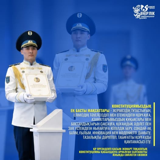 «Конституциямыздың ең басты мақсаттары – жеріміздің тұтастығын, еліміздің тәуелсіздігі мен егемендігін қорғауға, азаматтарымыздың құқықтары мен бостандықтарын сақтауға, қоғамдық әділет пен заң үстемдігін нығайтуға кепілдік беру, сондай-ақ білім, ғылым, инновация мен мәдениетті дамыту, тазалықты дәріптеп, табиғатты қорғауды қамтамасыз ету», – деді Президент.